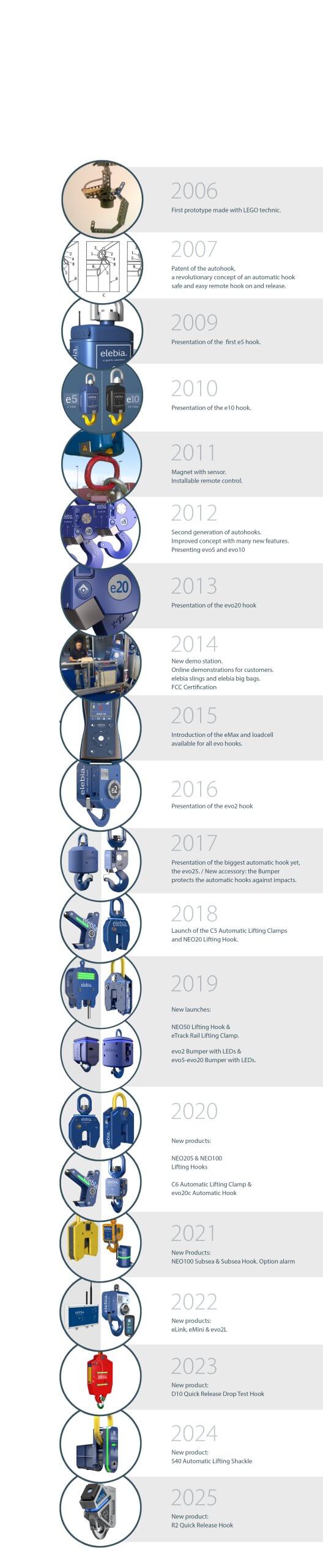 Los lanzamientos más innovadores para nuestra compañía tuvieron lugar en 2018, con las Garras de Elevación Automáticas C5, diseñadas exclusivamente para elevar y mover planchas de acero, tubos y/o vigas, y el Gancho de Elevación NEO20. Estos novedosos y revolucionarios productos representan nuevas soluciones en la industria de la elevación y de paso consolidó nuestra posición como líder del mercado en soluciones automatizadas de elevación.