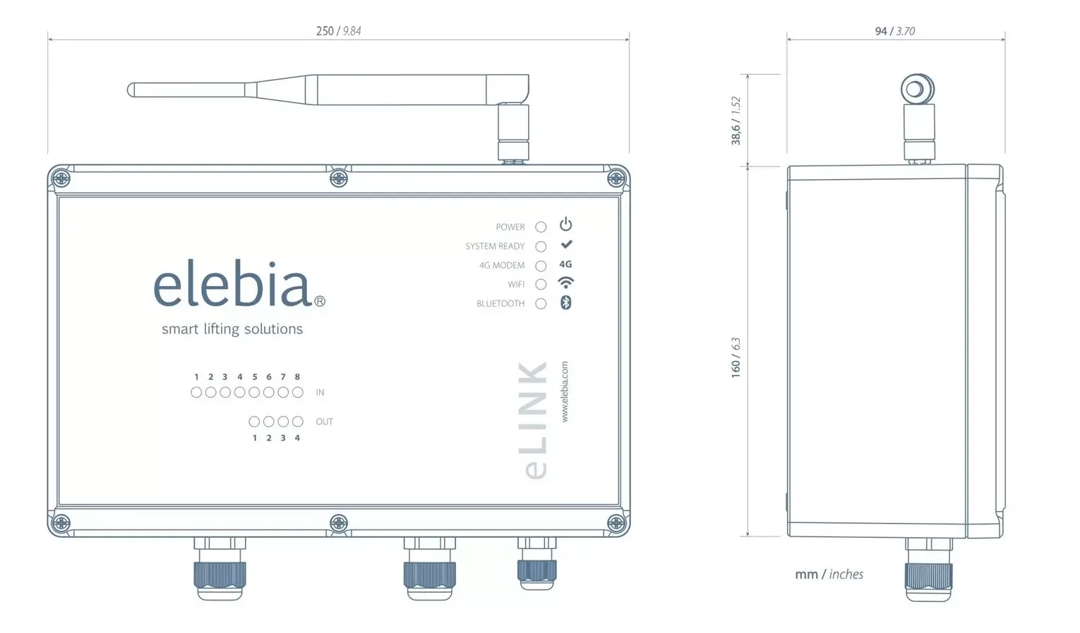 The eLINK is a central control and data acquisition system that has three communication channels: with the user through a web application connected to any mobile device, be it PC, tablet and/or smartphone; with the elements of the crane through 8 input channels and 4 output channels; and with the lifting hooks through radio communication.